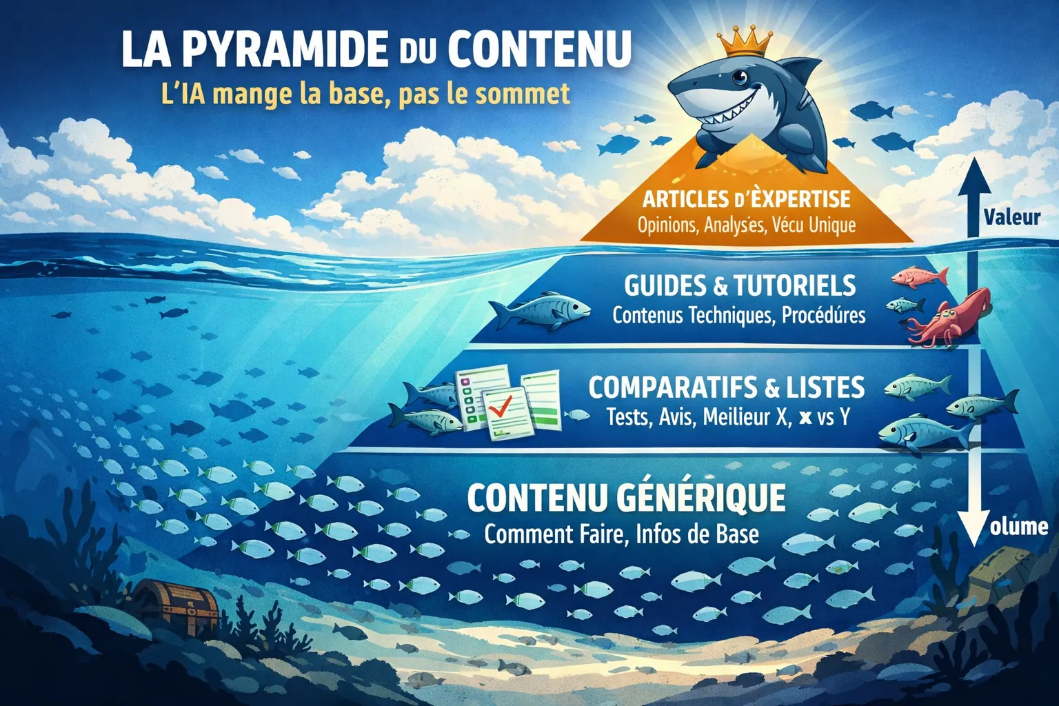 🧱 La pyramide du contenu : l’IA mange la base, pas le sommet